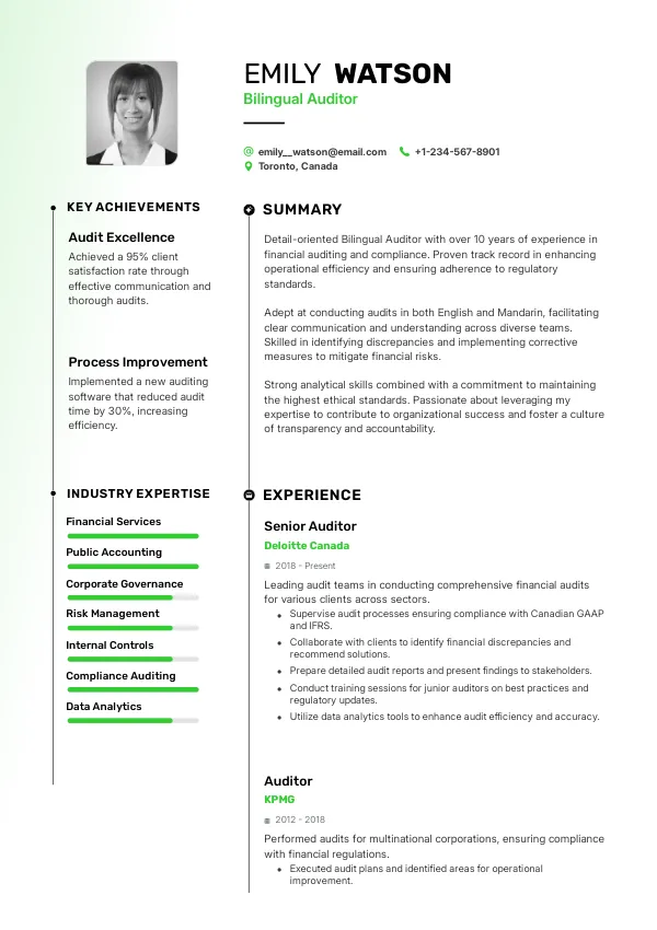 - Align your resume with the specific requirements of bilingual auditor roles using TrueCV.