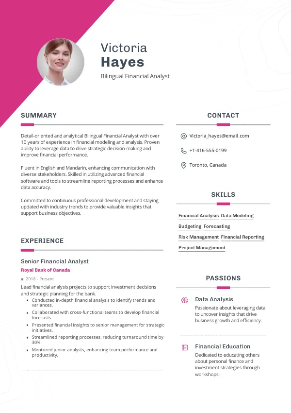 In 2026, leading financial institutions such as Royal Bank of Canada, TD Bank, and Scotiabank will be actively seeking Bilingual Financial Analysts to meet their growing needs for bilingual reporting and analysis. These employers recognize the importance of bilingual professionals in serving diverse client bases and complying with regulatory standards. A TrueCV-optimized resume can help candidates stand out in applications to these top employers.