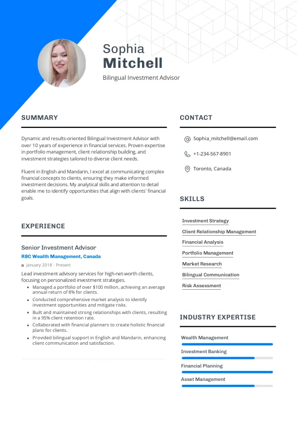 Major financial institutions such as RBC, TD Bank, and Scotiabank are ramping up their hiring of Bilingual Investment Advisors in 2026. These employers recognize the value of bilingual advisors in serving a diverse client base and are investing in talent that can meet these needs. A TrueCV-optimized resume can help you stand out to these top employers.