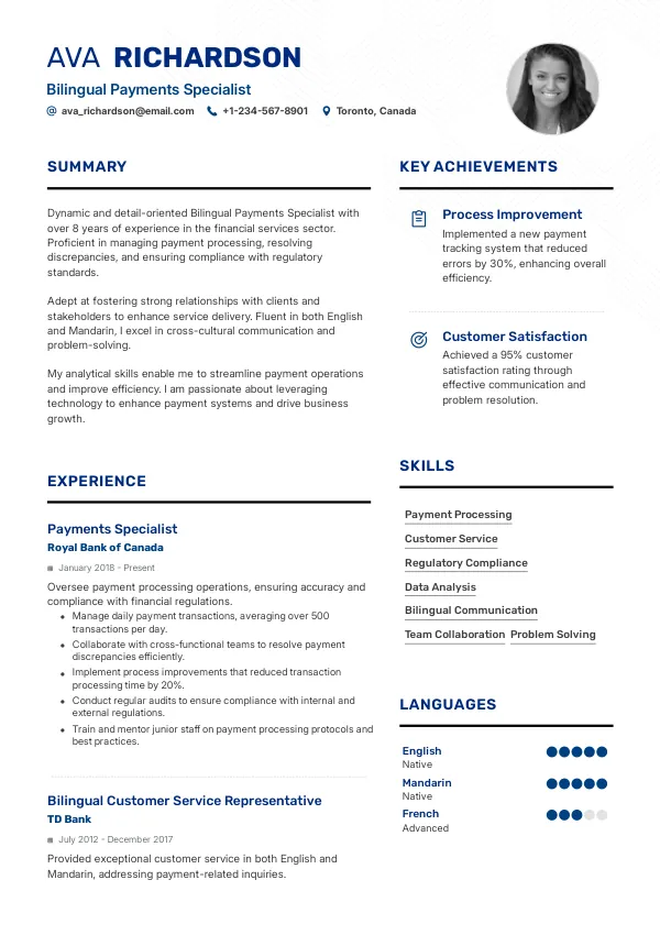 Leading financial institutions such as TD Bank, RBC, and Scotiabank are expected to ramp up hiring for Bilingual Payments Specialists in 2026. These employers recognize the importance of bilingual communication in enhancing customer experience and ensuring compliance with regulations. A TrueCV-optimized resume can help you align your skills with the specific needs of these top employers.