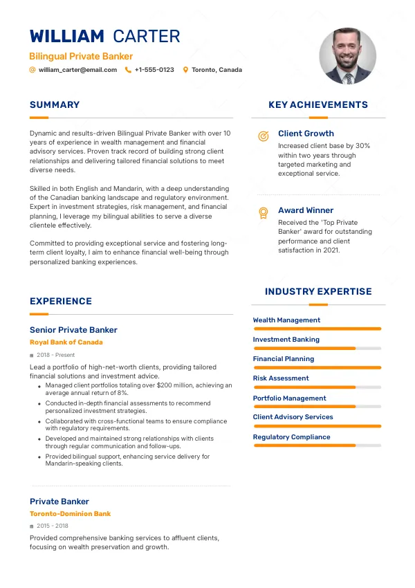 - Achievement: Successfully managed a portfolio of high-net-worth clients, increasing client satisfaction by 30% through personalized service.
