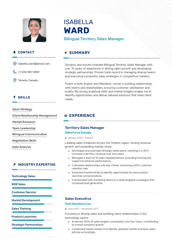 The demand for bilingual professionals in Canada is expected to remain strong, providing a stable career outlook for Bilingual Territory Sales Managers. Companies are increasingly prioritizing diversity and inclusion, which enhances employability for bilingual candidates. Highlighting this stability and the ability to work in diverse environments on a TrueCV resume can improve job prospects.