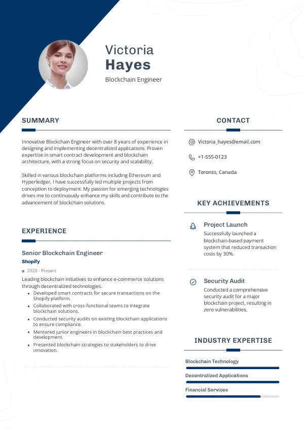 - Achievement: Successfully led a team to develop a decentralized application that increased transaction efficiency by 30%.