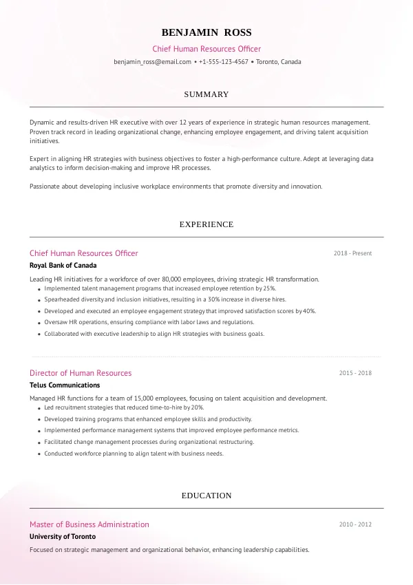 Leading public sector organizations, such as the Government of Canada, provincial health authorities, and municipal governments, will actively seek CHROs in 2026. These employers are prioritizing strategic HR leadership to drive organizational change and enhance employee engagement. Candidates should tailor their TrueCV-optimized resumes to align with the specific needs of these organizations.