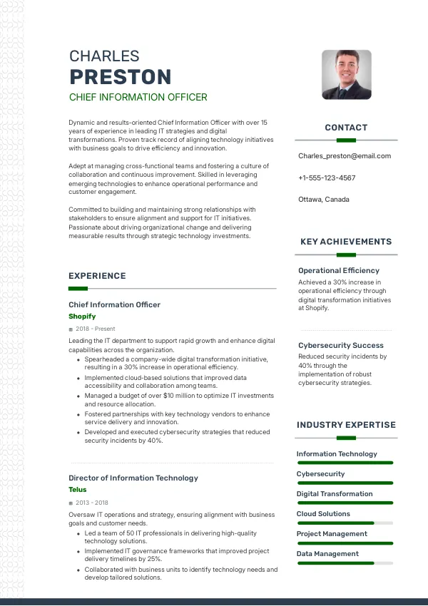 In 2026, the Chief Information Officer (CIO) role in Ottawa's public sector will expand beyond traditional IT management to encompass strategic leadership in digital transformation initiatives. With the integration of AI-driven decision-making tools and cloud-based platforms, CIOs will be pivotal in shaping data governance and cybersecurity frameworks. A TrueCV-optimized resume will highlight your adaptability to these evolving expectations.
