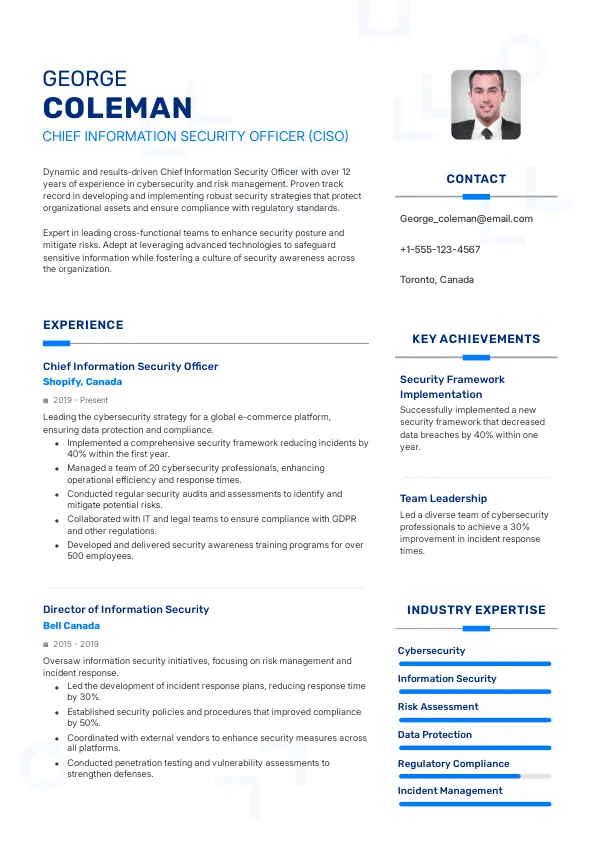 - Achievement: Developed a comprehensive cybersecurity strategy that reduced incidents by 40%.