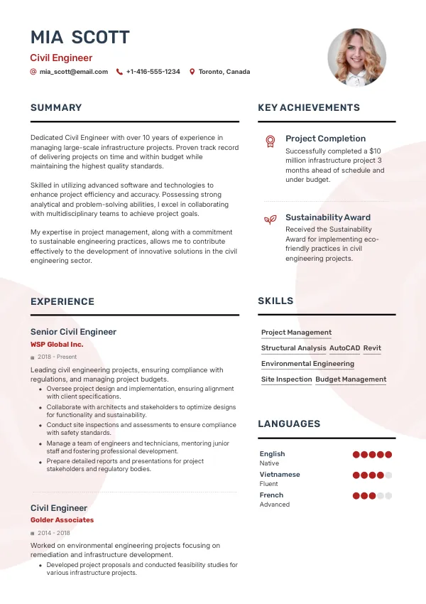 Get a professional Civil Engineer resume tailored to your skills and Canada’s hiring trends.