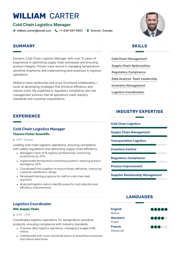 The logistics sector is projected to remain robust, providing stable employment opportunities for Cold Chain Logistics Managers. The Canadian government is likely to support skilled immigration in this field, enhancing career prospects. A TrueCV-optimized resume will position you favorably for these opportunities by emphasizing your relevant experience and skills.