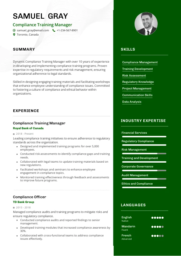 The finance and banking sector in Canada is projected to maintain steady growth, leading to stable employment opportunities for Compliance Training Managers. The ongoing need for compliance training ensures that professionals in this field will have a secure career path. A TrueCV can help you position yourself effectively in this stable job market.