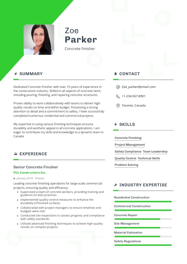 The construction industry in Canada is expected to maintain a steady demand for Concrete Finishers, providing a stable career path. The government's commitment to infrastructure projects will support job security, and candidates with the right skills will find ample opportunities, especially those with resumes tailored to highlight their qualifications and adaptability.