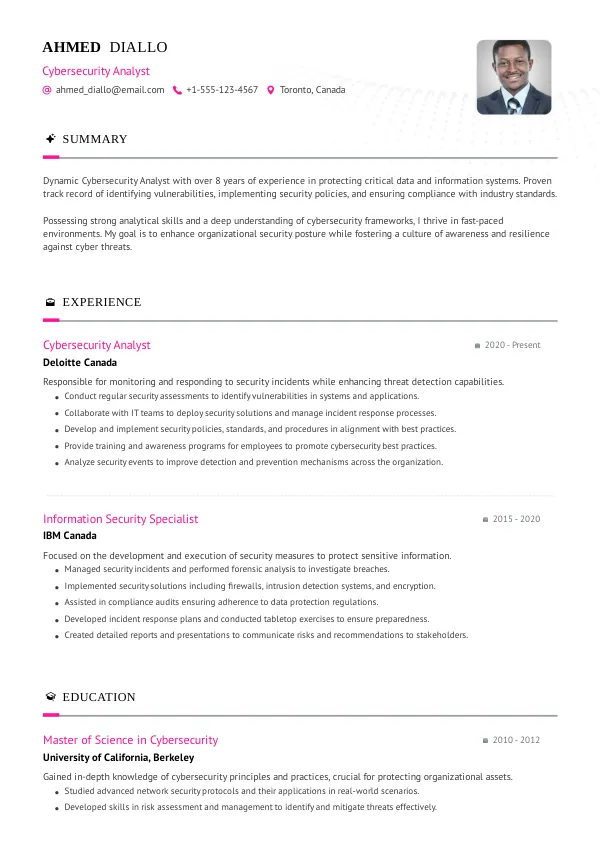 Get a professional Cybersecurity Analyst resume tailored to your skills and Canada’s hiring trends.