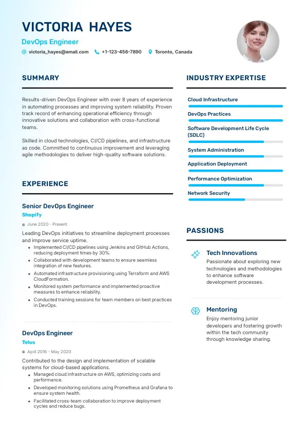 Get a professional DevOps Engineer resume tailored to your skills and Canada’s hiring trends.