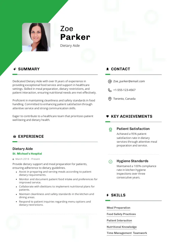 - Tailored resume intake focusing on dietary aide specifics.