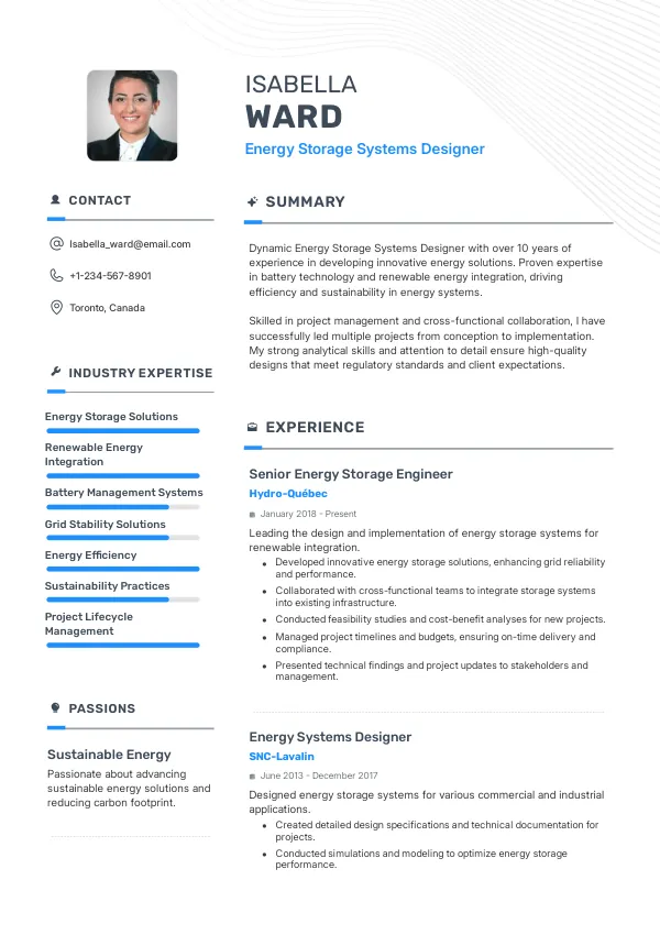 The renewable energy sector is projected to remain stable and grow in Canada, providing ample job opportunities for Energy Storage Systems Designers. This stability is bolstered by government initiatives and investments in green technology. A TrueCV-optimized resume can enhance your employability by clearly demonstrating your qualifications and alignment with industry needs.