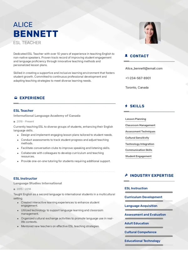 In 2026, leading educational institutions such as the Toronto District School Board, Vancouver Community College, and the University of Alberta are ramping up their hiring of ESL Teachers to meet the growing demand. These employers are looking for candidates who can effectively integrate technology into their teaching practices. A TrueCV-optimized resume can help you stand out to these top employers.