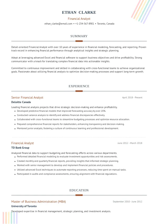 As a Financial Analyst in Canada, your role involves analyzing financial data and trends to help organizations make informed decisions. Crafting a professional resume that showcases your skills and experience is crucial in securing interviews in this competitive field.