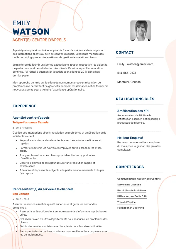 Un CV Agent(e) centre d’appels axé sur les résultats, qui met en valeur votre impact et passe les filtres ATS utilisés au Québec.