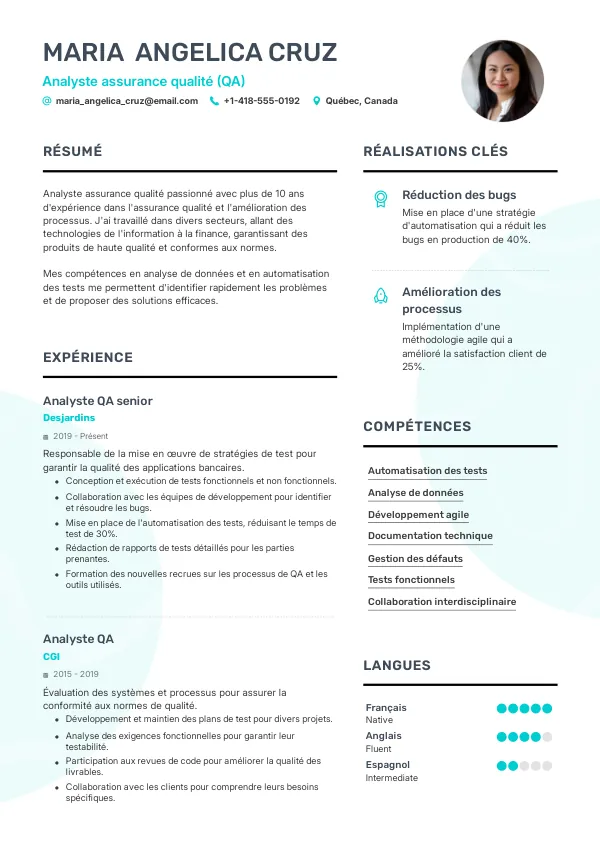 Obtenez un CV Analyste assurance qualité (QA) professionnel, adapté à vos compétences et au marché de l’emploi du Québec.