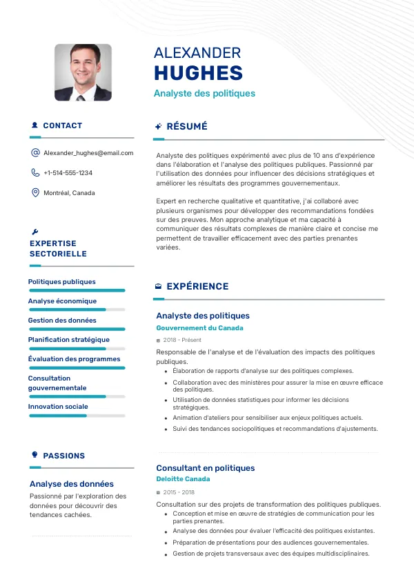 Obtenez un CV Analyste des politiques professionnel, adapté à vos compétences et au marché de l’emploi du Québec.
