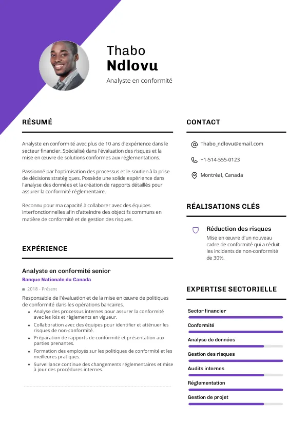 Un CV Analyste en conformité axé sur les résultats, qui met en valeur votre impact et passe les filtres ATS utilisés au Québec.