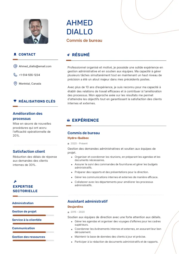 Obtenez un CV Commis de bureau professionnel, adapté à vos compétences et au marché de l’emploi du Québec.