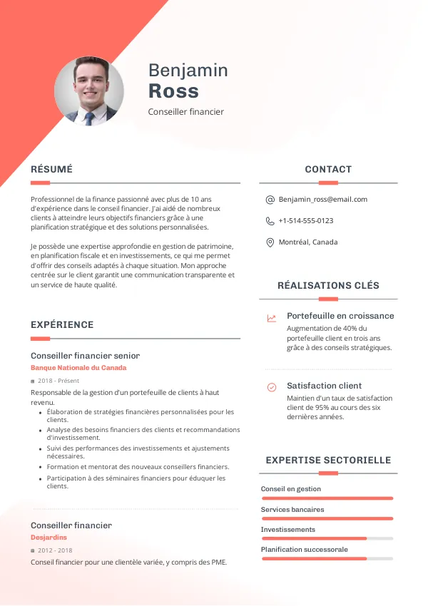 Obtenez un CV Conseiller(ère) financier(ère) professionnel, adapté à vos compétences et au marché de l’emploi du Québec.