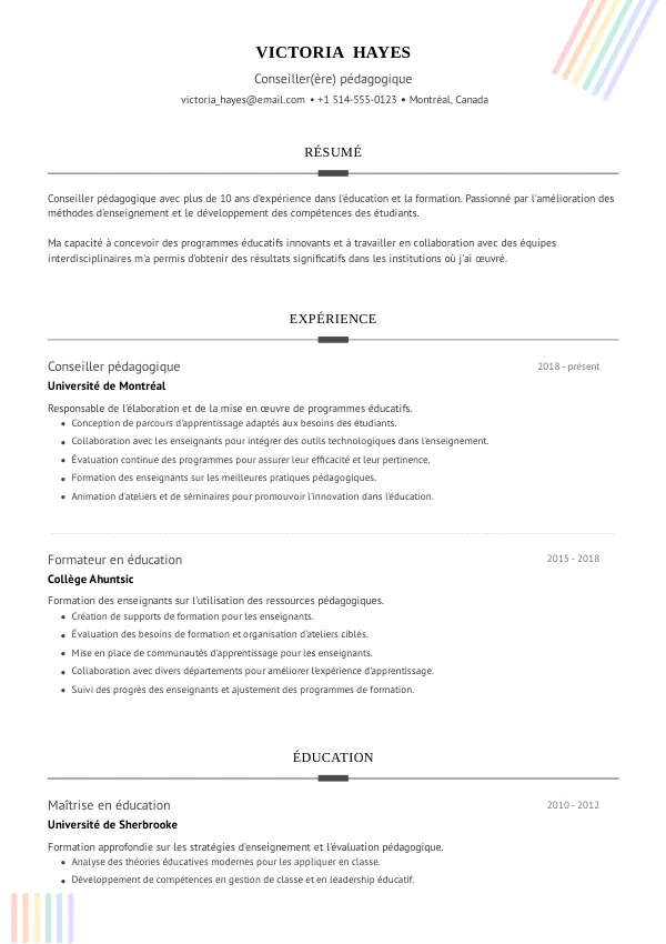 Obtenez un CV Conseiller(ère) pédagogique professionnel, adapté à vos compétences et au marché de l’emploi du Québec.