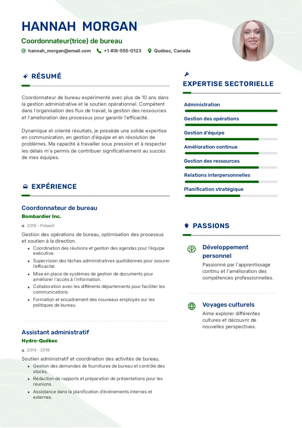 Obtenez un CV Coordonnateur(trice) de bureau professionnel, adapté à vos compétences et au marché de l’emploi du Québec.