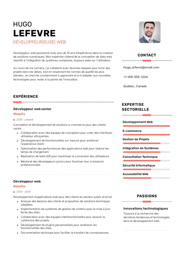 Obtenez un CV Développeur(euse) web professionnel, adapté à vos compétences et au marché de l’emploi du Québec.