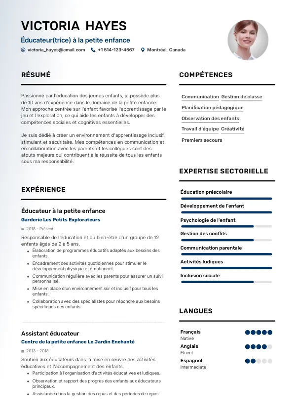 Obtenez un CV Éducateur(trice) à la petite enfance professionnel, adapté à vos compétences et au marché de l’emploi du Québec.