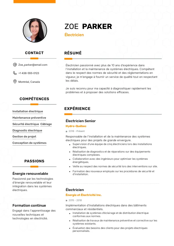 Obtenez un CV Électricien(ne) professionnel, adapté à vos compétences et au marché de l’emploi du Québec.