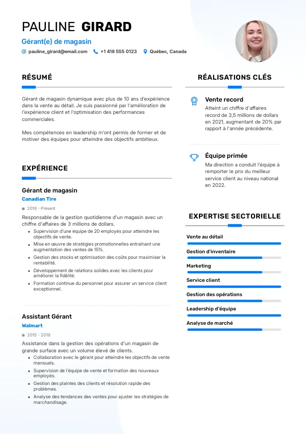 Obtenez un CV Gérant(e) de magasin professionnel, adapté à vos compétences et au marché de l’emploi du Québec.