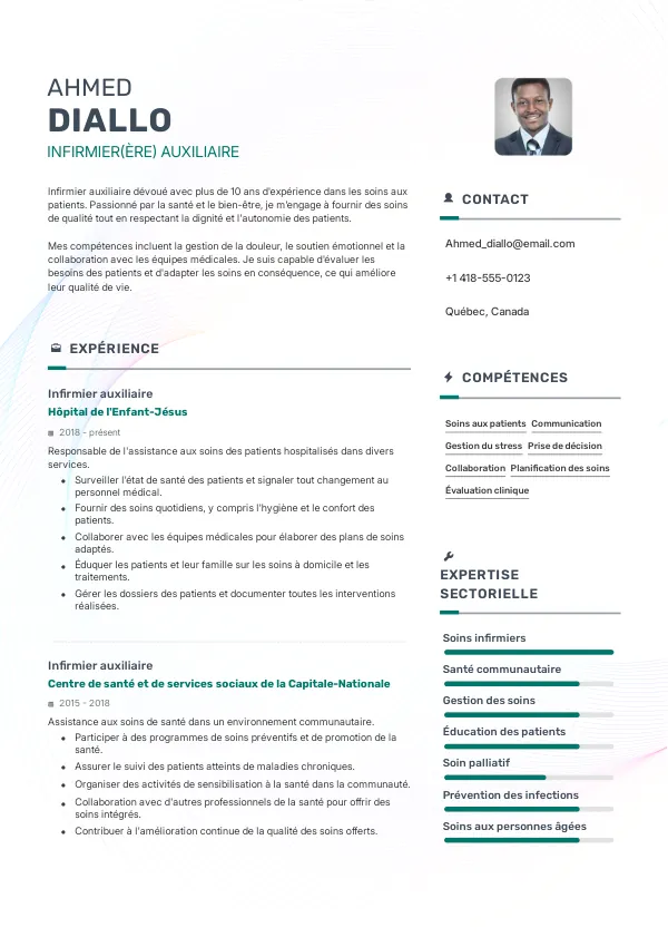 Un CV Infirmier(ère) auxiliaire axé sur les résultats, qui met en valeur votre impact et passe les filtres ATS utilisés au Québec.