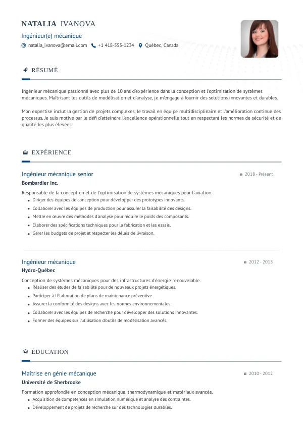 Obtenez un CV Ingénieur(e) mécanique professionnel, adapté à vos compétences et au marché de l’emploi du Québec.