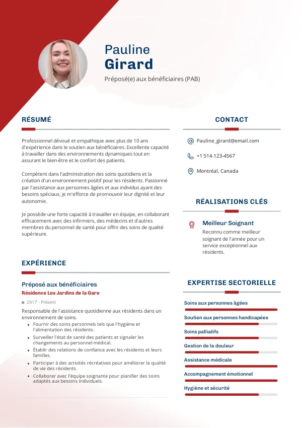 Obtenez un CV Préposé(e) aux bénéficiaires (PAB) professionnel, adapté à vos compétences et au marché de l’emploi du Québec.