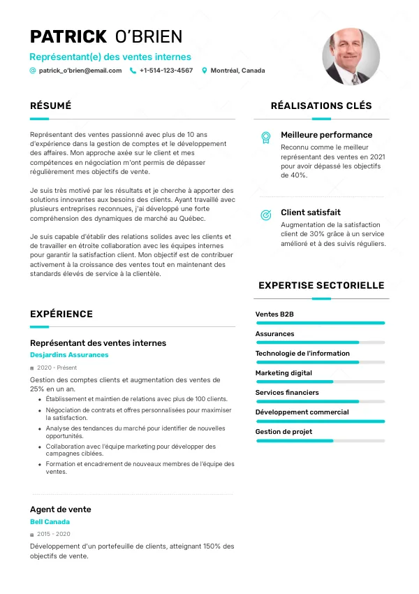 Obtenez un CV Représentant(e) des ventes internes professionnel, adapté à vos compétences et au marché de l’emploi du Québec.