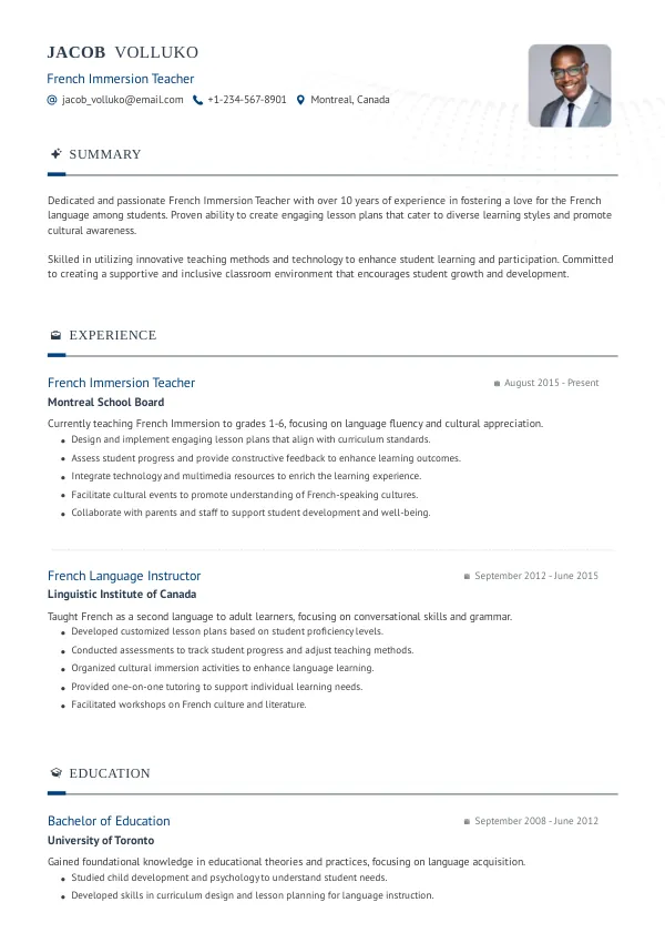 In 2026, the responsibilities of French Immersion Teachers will expand to include the integration of digital tools and resources into lesson plans, fostering a more interactive learning environment. Teachers will also be expected to collaborate with technology specialists to enhance language acquisition through innovative methods. A TrueCV-optimized resume will help candidates effectively communicate their experience with these new tools and collaborative approaches.