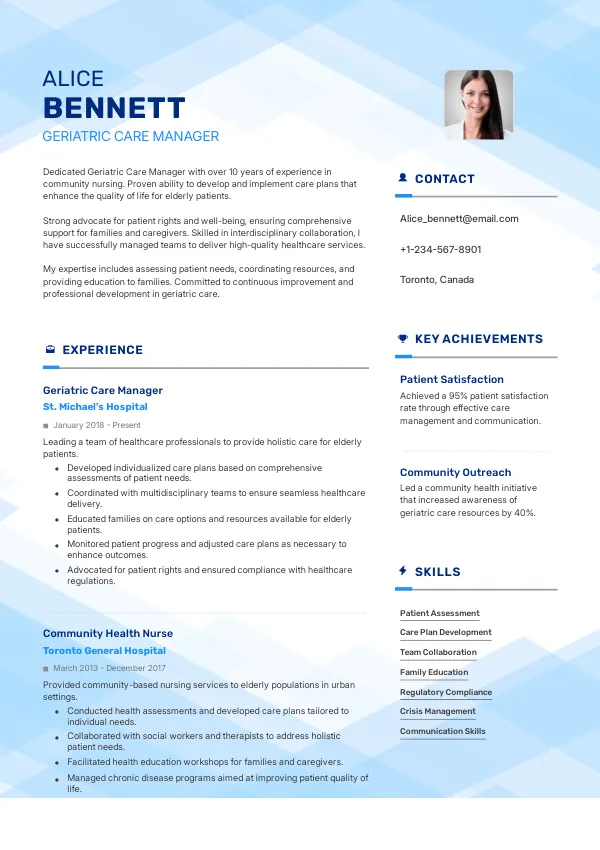 The healthcare sector in Canada is projected to maintain strong growth, providing stable career opportunities for Geriatric Care Managers in 2026. Employers are actively seeking skilled professionals, which enhances job security. A TrueCV-optimized resume can help you stand out in this competitive job market, ensuring you are well-positioned for long-term career success.