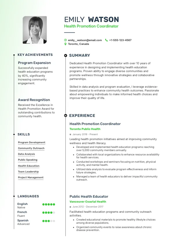 In 2026, the demand for Health Promotion Coordinators will contribute to greater career stability, with many employers looking to fill these roles permanently. The Canadian healthcare sector is expected to continue growing, providing ample opportunities for skilled professionals. A TrueCV-optimized resume will enhance your visibility to employers, increasing your chances of securing a stable position in this evolving field.