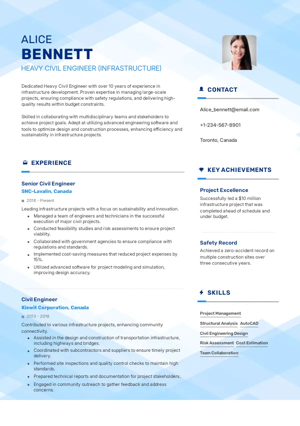The Canadian construction sector is expected to maintain a steady demand for Heavy Civil Engineers, providing strong career stability. This is particularly relevant for international candidates seeking work visas. A TrueCV that emphasizes relevant experience and skills will be critical in navigating the visa application process successfully.