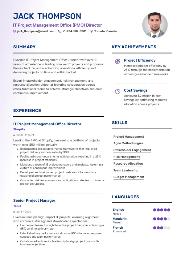 The Canadian job market for IT PMO Directors is expected to remain stable in 2026, with a consistent demand for skilled professionals. This stability is bolstered by the ongoing digital transformation initiatives across various sectors. Additionally, the demand for IT talent may facilitate visa opportunities for international candidates, making it essential to align resumes with the specific requirements of Canadian employers.