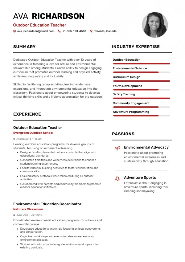 In 2026, the role of Outdoor Education Teacher in Canada evolves significantly, integrating advanced technologies such as virtual reality (VR) for immersive learning experiences. This shift necessitates a focus on environmental stewardship and sustainability, aligning with TrueCV's emphasis on showcasing relevant skills and experiences in your resume.