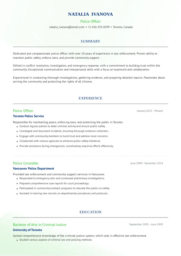 Get a professional Police Officer resume tailored to your skills and Canada’s hiring trends.