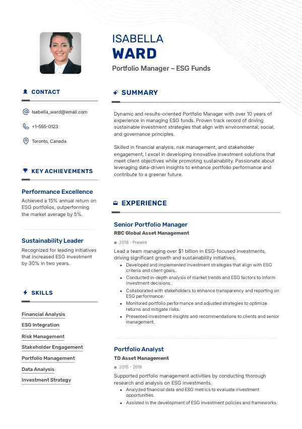 The demand for Portfolio Managers specializing in ESG Funds is surging in 2026 due to increased regulatory pressures and a growing investor preference for sustainable investment options. The Canadian government has introduced new compliance norms that require financial institutions to disclose ESG-related risks and opportunities, creating a need for skilled professionals who can navigate these complexities. A TrueCV-optimized resume can effectively communicate a candidate's understanding of these regulations and their impact on investment strategies, making them more attractive to employers.