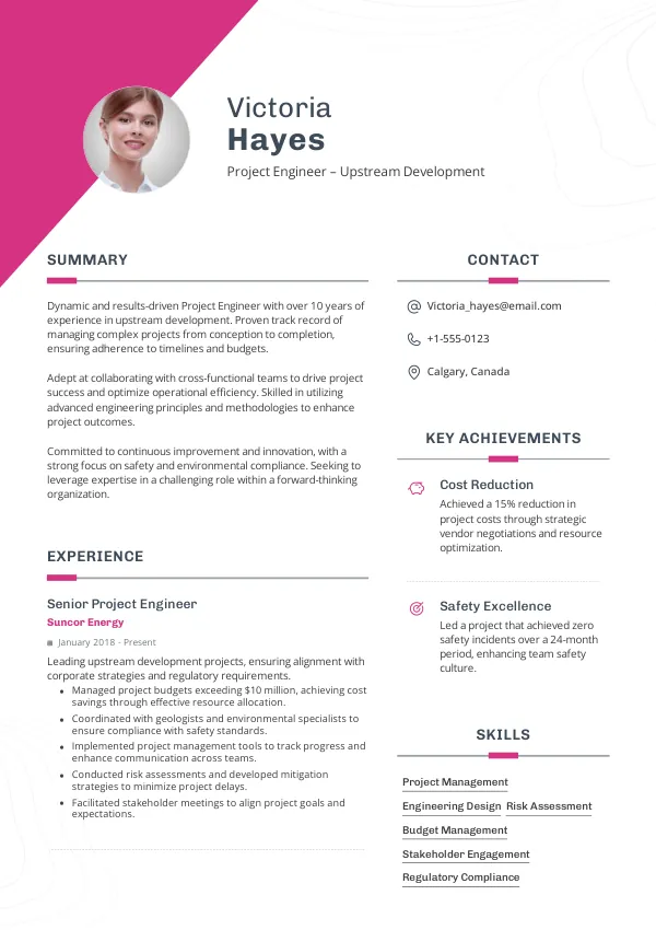 The Oil & Gas sector in Canada is expected to maintain a stable demand for Project Engineers, driven by ongoing investments in infrastructure and technology. This stability will provide a favorable job market for candidates. Tailoring your resume to reflect adaptability and long-term career goals will enhance your employability.