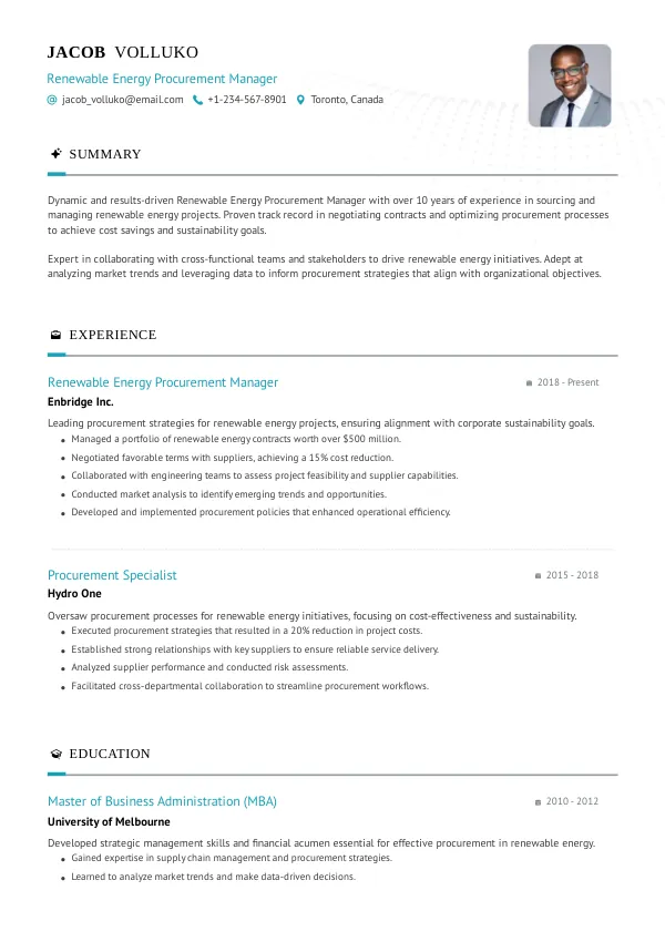- Achievement: Successfully negotiated contracts resulting in a 20% cost reduction for renewable energy projects.