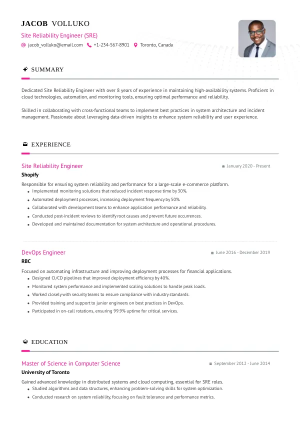 In 2026, the role of Site Reliability Engineer (SRE) in Canada is set to evolve significantly, driven by advancements in automation and cloud-native technologies. As organizations increasingly adopt DevOps practices, SREs will be expected to bridge the gap between development and operations, ensuring system reliability while enhancing deployment speed. A TrueCV-optimized resume will help candidates highlight their adaptability to these changes, aligning with the evolving expectations of employers.
