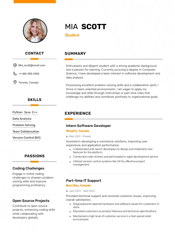 Get a professional Student resume tailored to your skills and Canada’s hiring trends.