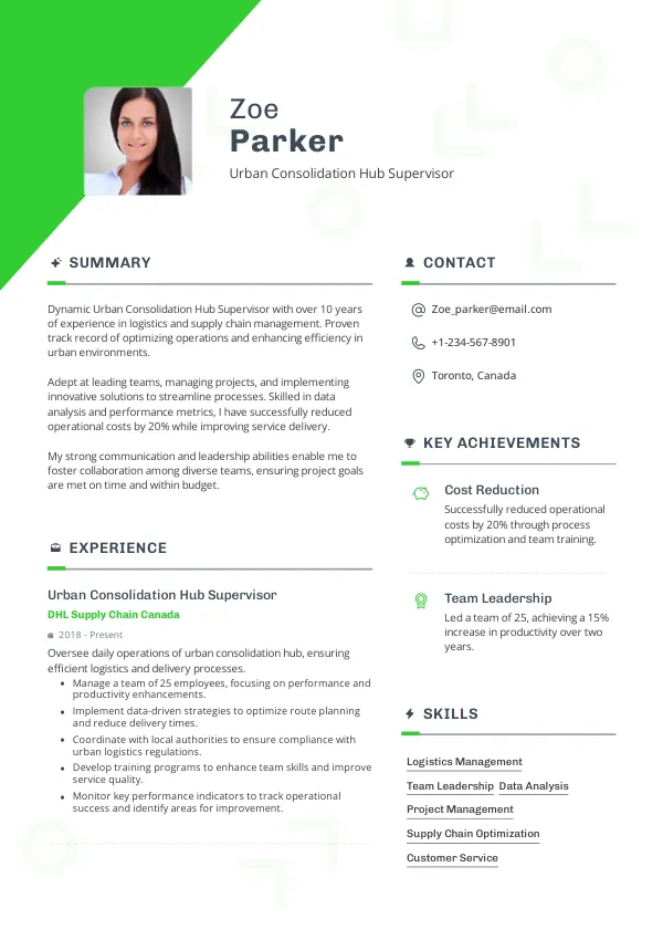 As the logistics sector continues to grow, Urban Consolidation Hub Supervisors will enjoy strong job stability and numerous opportunities for career advancement. The demand for skilled professionals in this field will create favorable conditions for visa applicants, particularly in Canada. A TrueCV-optimized resume can enhance employability by clearly articulating relevant experience and skills.